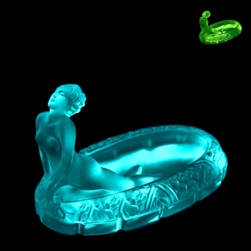 Made of blue uranium glass, the bowl preserves its original decorative function and displays a characteristic green glow when exposed to ultraviolet light, confirming its uranium glass composition. It is a highly collectible small-format piece that combines Art Deco figurative design and uranium glass craftsmanship.