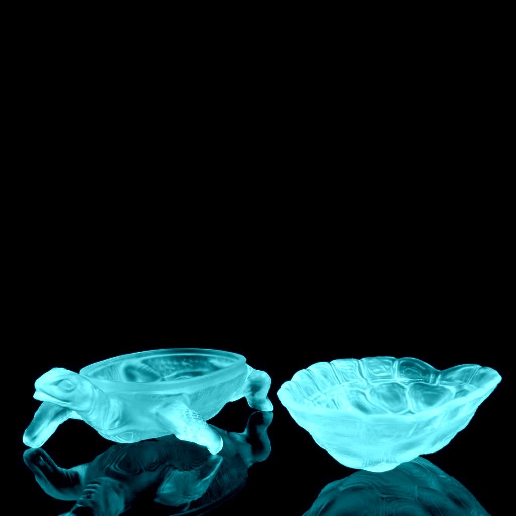 Made of blue uranium glass, the jewelry box shows a characteristic green glow when exposed to ultraviolet light, confirming its uranium glass composition. This turtle jewelry box is a highly collectible Art Deco piece, prized for its original form, refined sculptural quality, and classic 1930s Bohemian uranium glass craftsmanship.