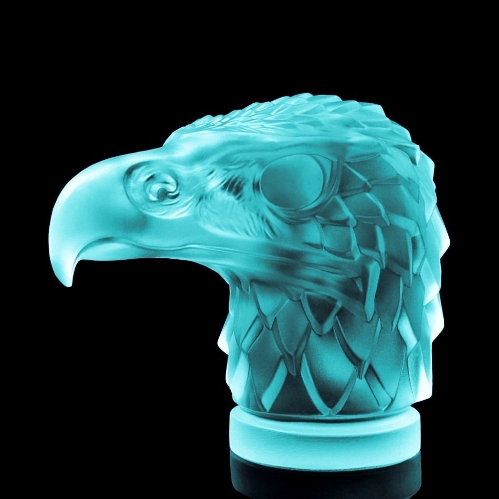 Art Deco Eagle Head Hood Ornament Blue Uranium Glass — 1930s H. Hoffmann