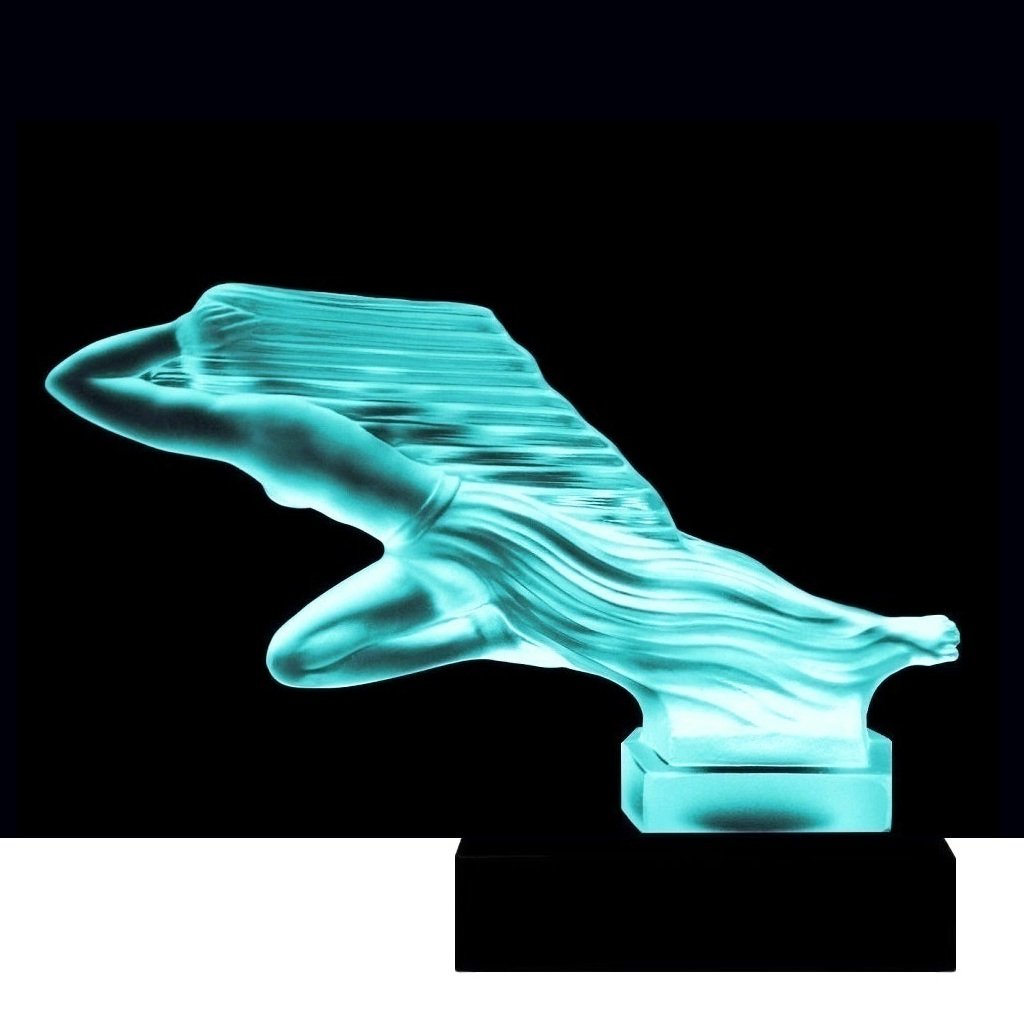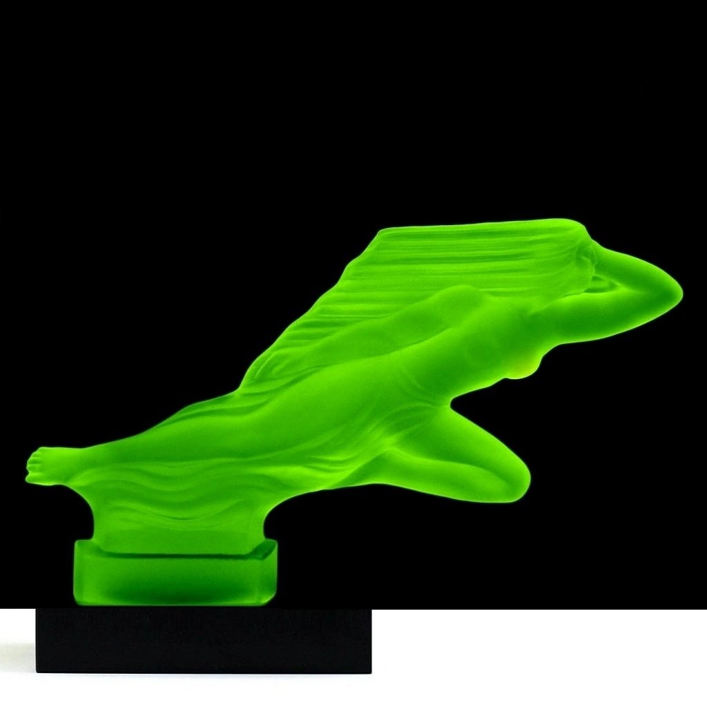 Made of blue uranium glass, the surface features a satin matte finish and glows green under ultraviolet light, confirming its uranium glass composition. This example is mounted on a black glass base, which enhances contrast, stability, and overall presentation. Originally intended as a car hood ornament, today the Girl in the Wind model is highly sought after as a collectible Art Deco automotive mascot and decorative display piece.