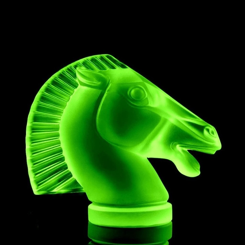 Made of blue uranium glass, the hood ornament displays a vivid green glow under UV light, confirming its uranium glass composition. As a genuine vintage hood ornament car mascot, this piece is a desirable collectible for enthusiasts of Art Deco design, uranium glass, and historic automotive accessories.