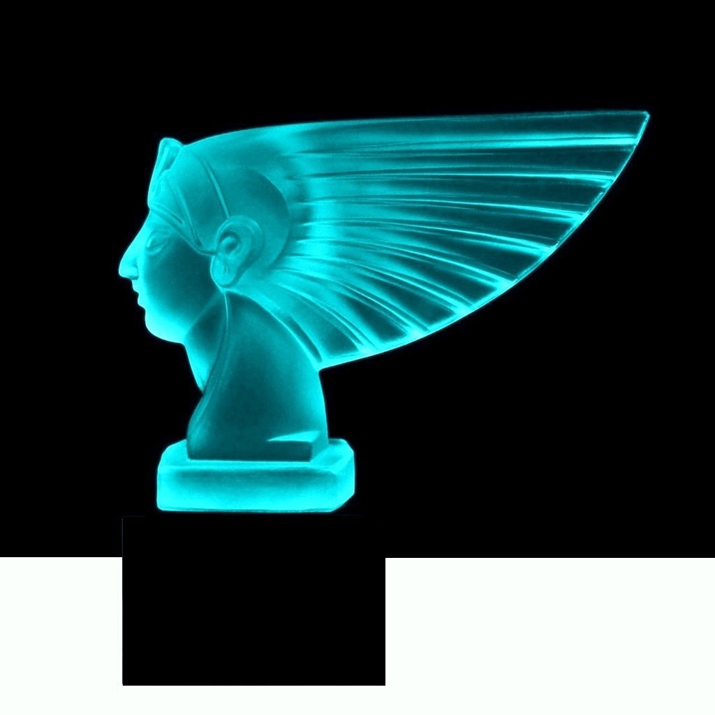 Made of blue uranium glass, the surface has a satin matte finish and glows green under ultraviolet light, confirming its uranium glass composition. This example is mounted on a black glass base, which enhances contrast, stability, and overall presentation. Originally intended as a car hood ornament and car mascot, today the Pharaoh Head model is highly sought after as a collectible Art Deco automotive sculpture and display piece.