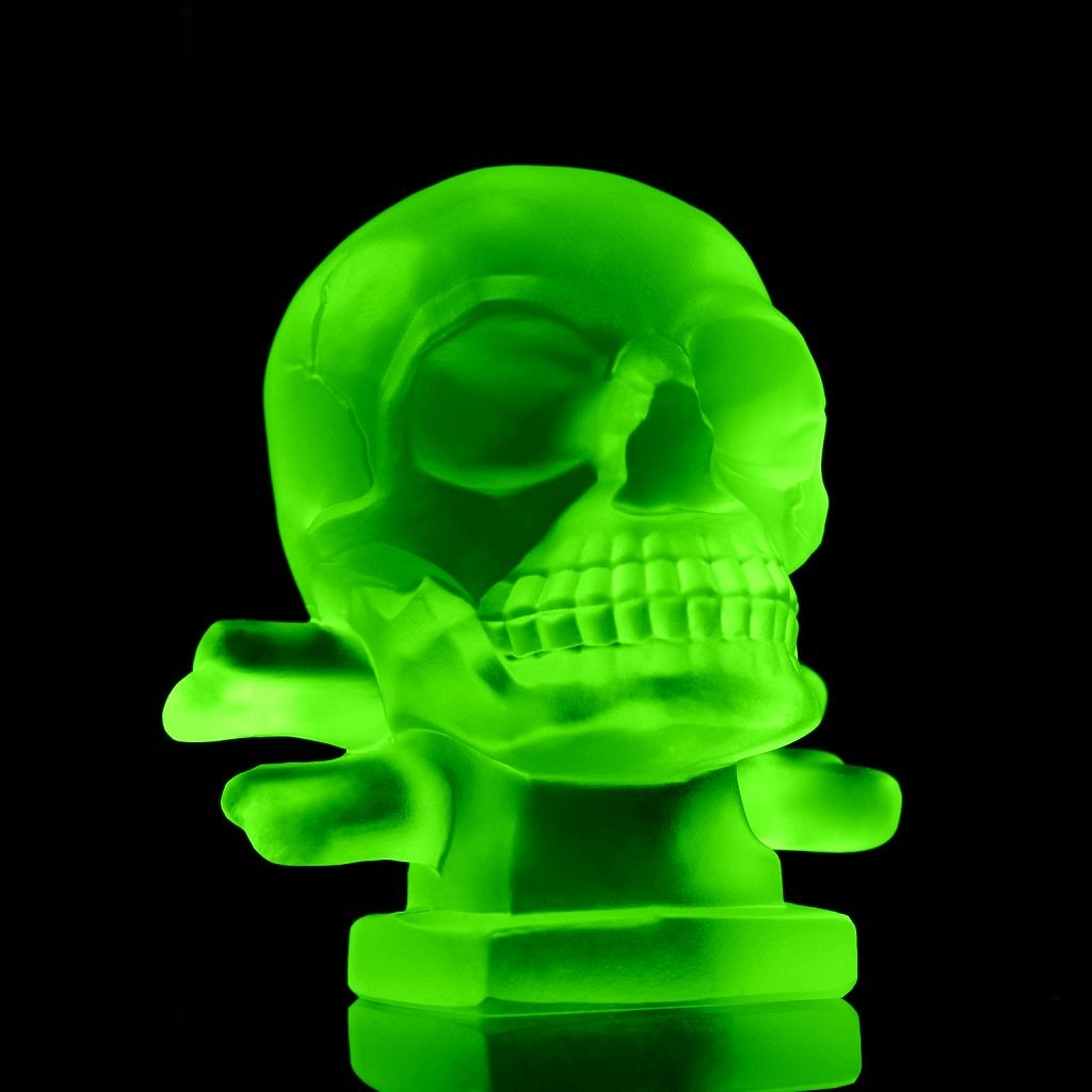 Made of blue uranium glass, the surface has a satin matte finish and glows green under ultraviolet light, confirming its uranium glass composition. Originally intended as a car hood ornament (car mascot), this skull model is today a highly desirable collectible for enthusiasts of Art Deco automotive design, uranium glass, and historic hood ornaments.