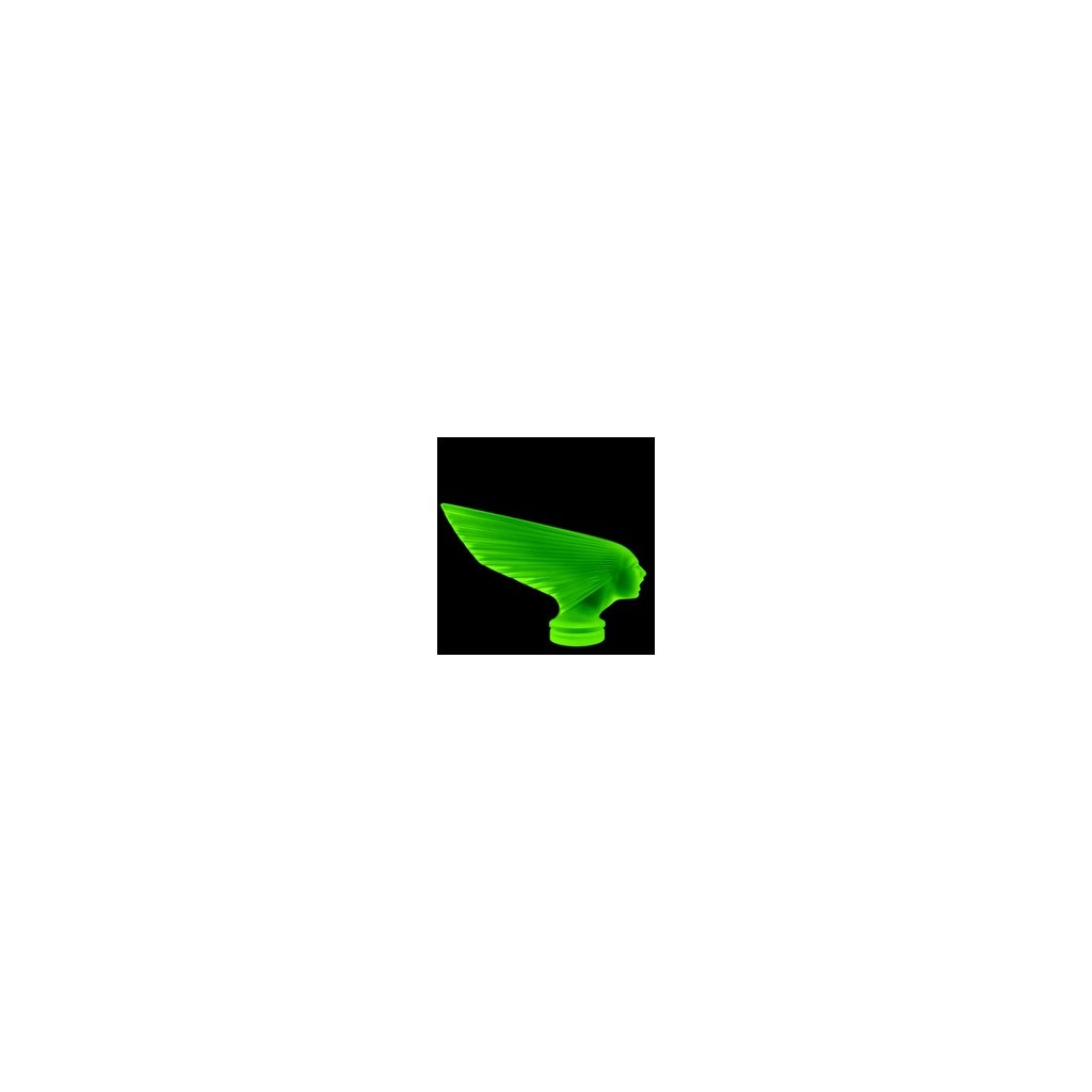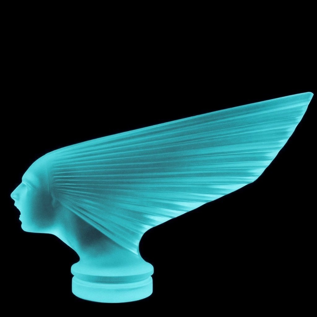 Made of blue uranium glass, the ornament displays a vivid green UV glow, confirming its uranium glass composition. Blue uranium glass represents a rarer and more refined color variant, valued by collectors for its elegant daylight appearance and striking contrast under ultraviolet light. The Victoire (Spirit of the Wind) model is an iconic example of Art Deco automotive design and a highly desirable collectible for enthusiasts of hood ornaments, car mascots, uranium glass, and historic car accessories.