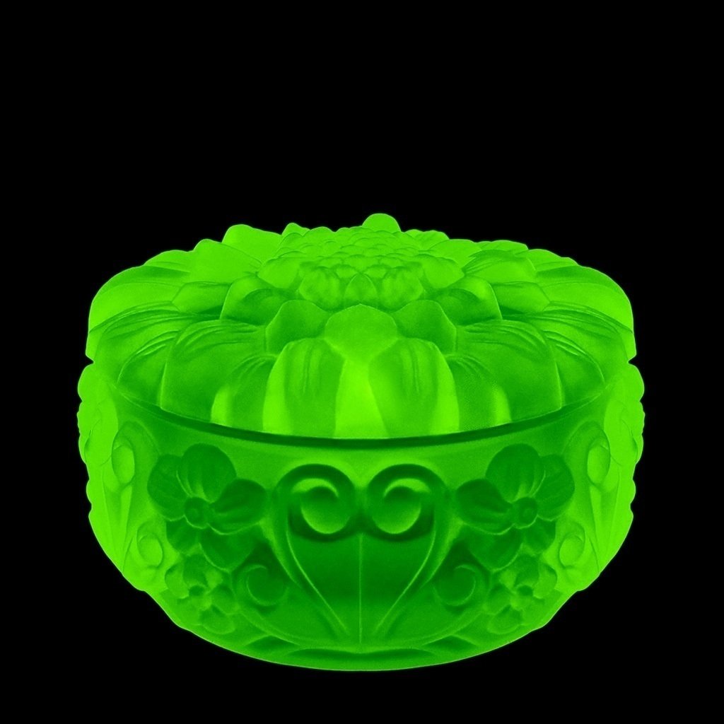 1930s Art Deco Uranium Glass Flower Jewelry Box – Bohemian Vaseline Glass Trinket Jar | Glows Under UV Light