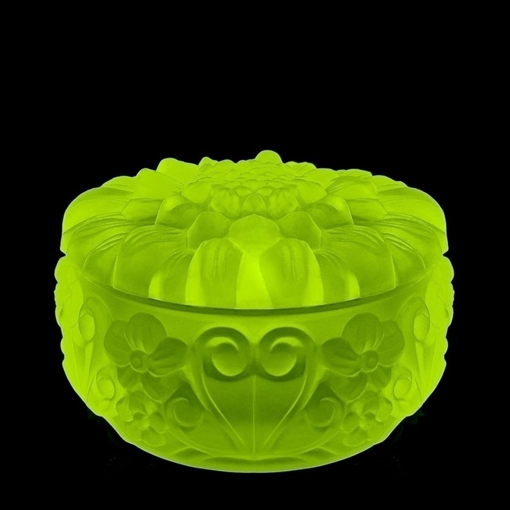 This authentic 1930s Art Deco yellow uranium glass flower jewelry box was designed and made in Bohemia (Czechoslovakia) using original antique molds from the interwar period. It features an elegant floral lid and smooth satin Vaseline glass surface, showcasing the finest craftsmanship of the Czech Art Deco era.