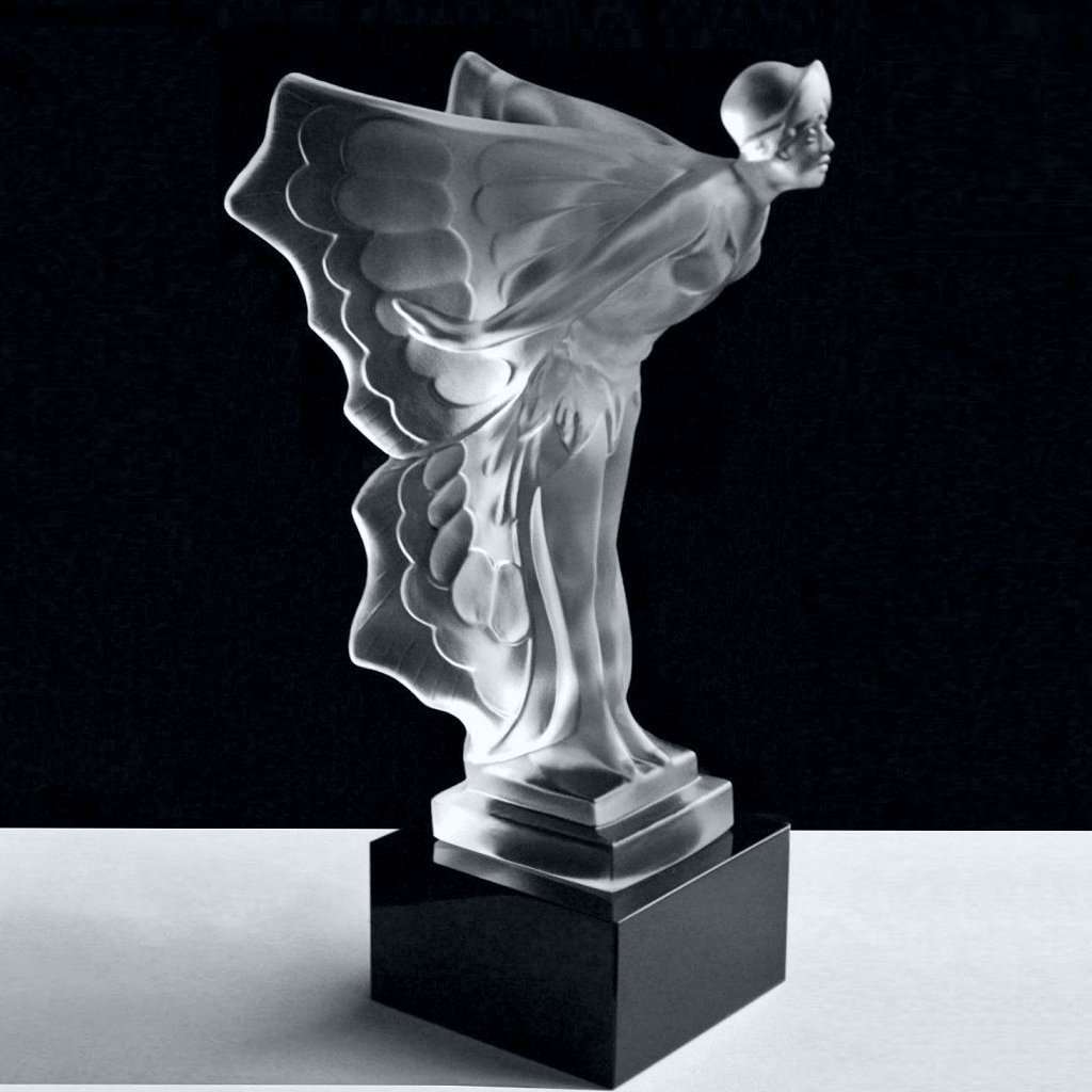 The stylized female figure with flowing wings reflects strong French Art Deco influence, which shaped European decorative and sculptural design in the early 20th century. The Flying Lady form is widely associated with luxury automotive mascots such as the Rolls-Royce Spirit of Ecstasy, which inspired a whole generation of Art Deco hood ornament designs. Hoffmann’s approach shows inspiration drawn from René Lalique, particularly in the smooth modeling, dynamic lines, and balanced proportions, while remaining distinctly Bohemian in execution.