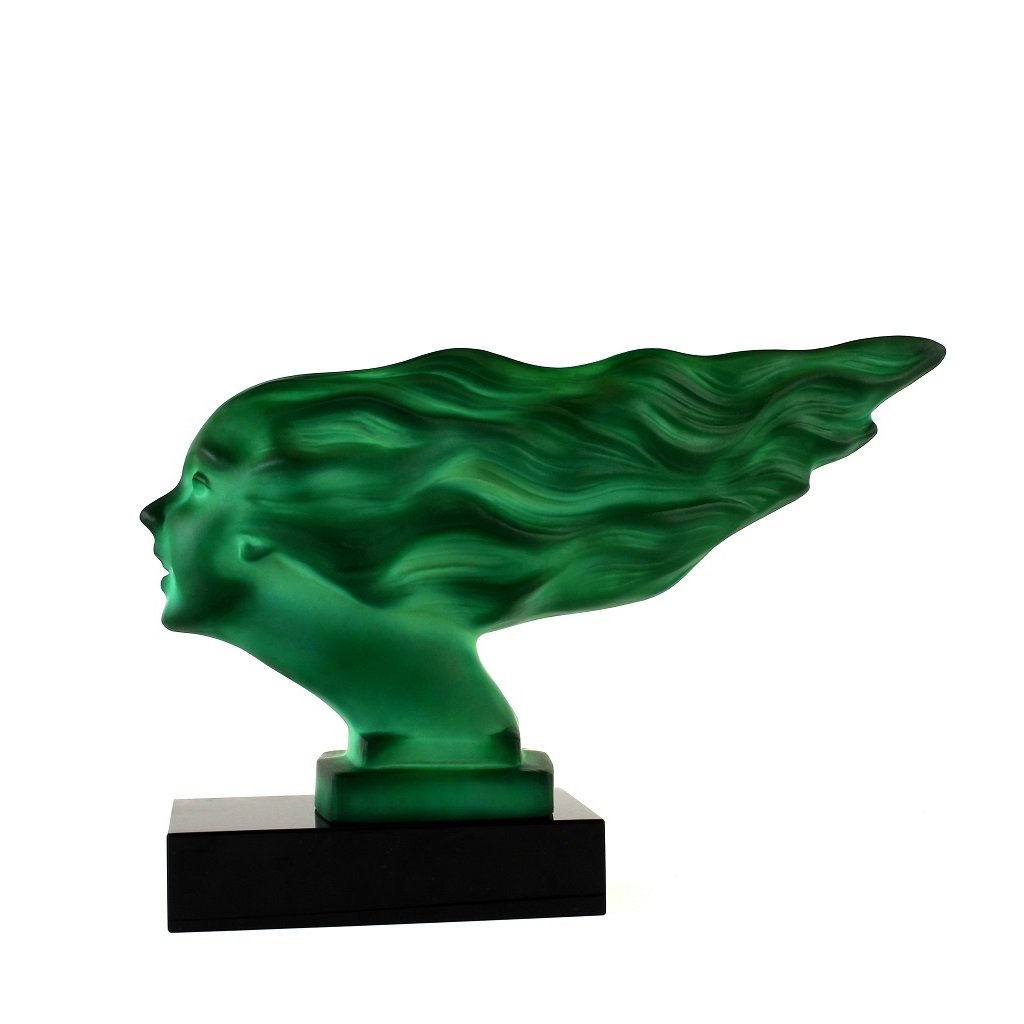 Art Deco Speed Girl Hood Ornament Malachite Glass with Black Glass Base — 1930s H. Hoffmann