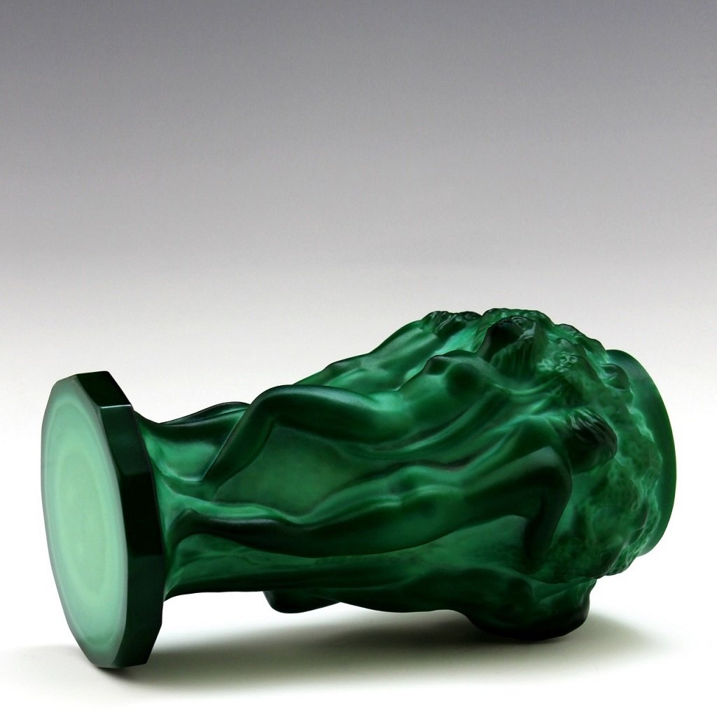 Made of malachite glass, the vase preserves its original decorative intent for interior display. The rich marbled green coloration imitates natural stone textures, enhancing the sculptural depth of the figural relief. A highly collectible piece combining Art Deco figural design and refined decorative glass craftsmanship.