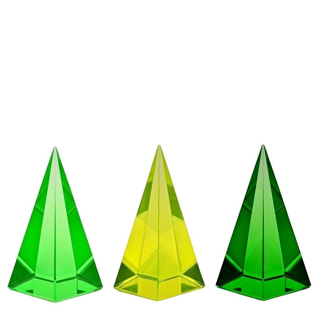 This set of three Bohemian uranium vaseline glass pyramid paperweights features a rare and visually striking three-tone color composition: one in bright yellow, one in light green, and one in deep green. Although different in shade, all three are made from genuine UV-reactive uranium glass, producing a powerful neon glow under black light.