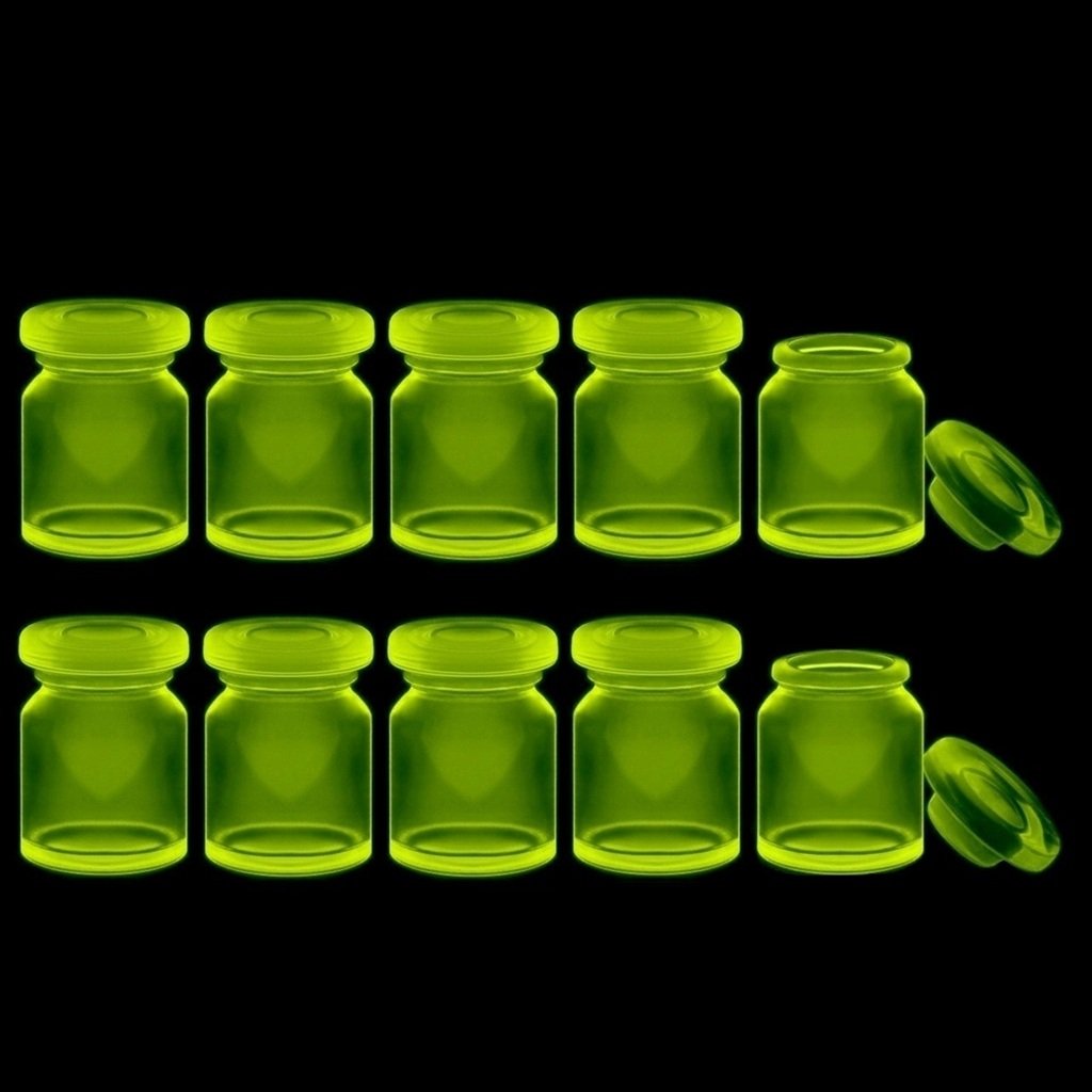 1930s Art Deco Uranium Glass Bottles with Lids – Collectible Bohemian Vaseline Glass Apothecary Trinket Jars (Set of 10)