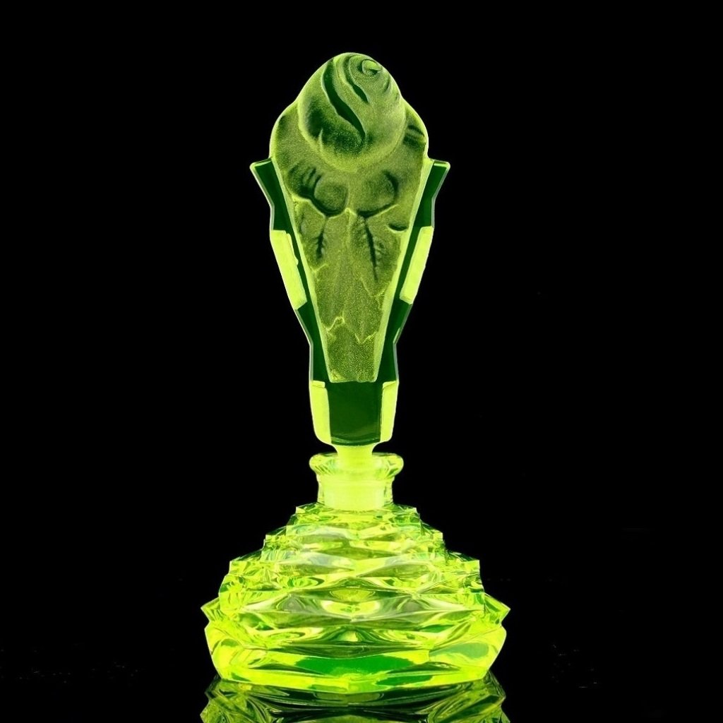 Bohemian Uranium Vaseline Glass UV-Glowing Art Deco Perfume Bottle 1930s H. Hoffmann – Stylized Deco Leaf Stopper