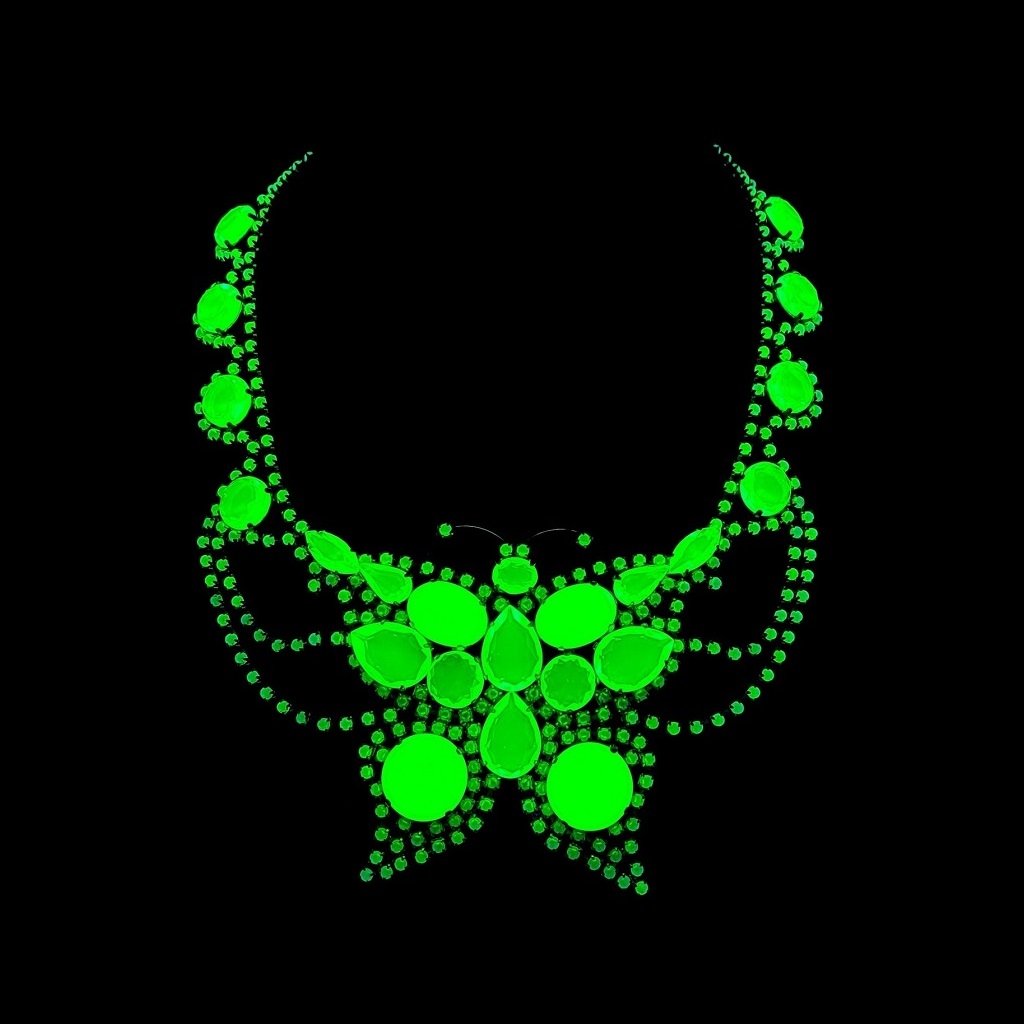 This vintage uranium glass necklace was produced in Bohemia and represents elegant jewelry design with a refined decorative composition. The butterfly motif design reflects clean geometry and balanced symmetry.
