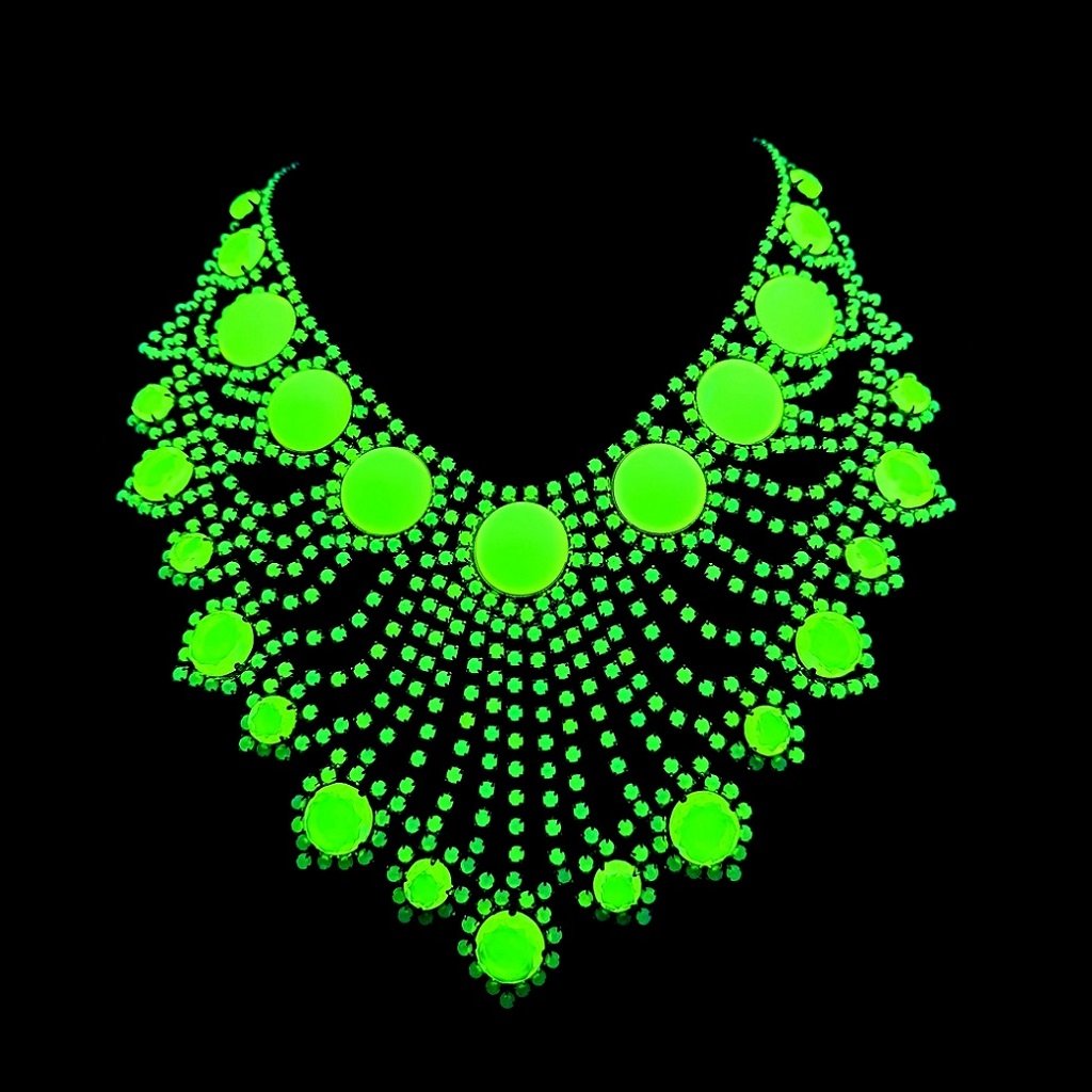 This vintage uranium glass necklace was produced in Bohemia and represents elegant jewelry design with a refined decorative composition. The fan radiance design reflects clean geometry and balanced symmetry.