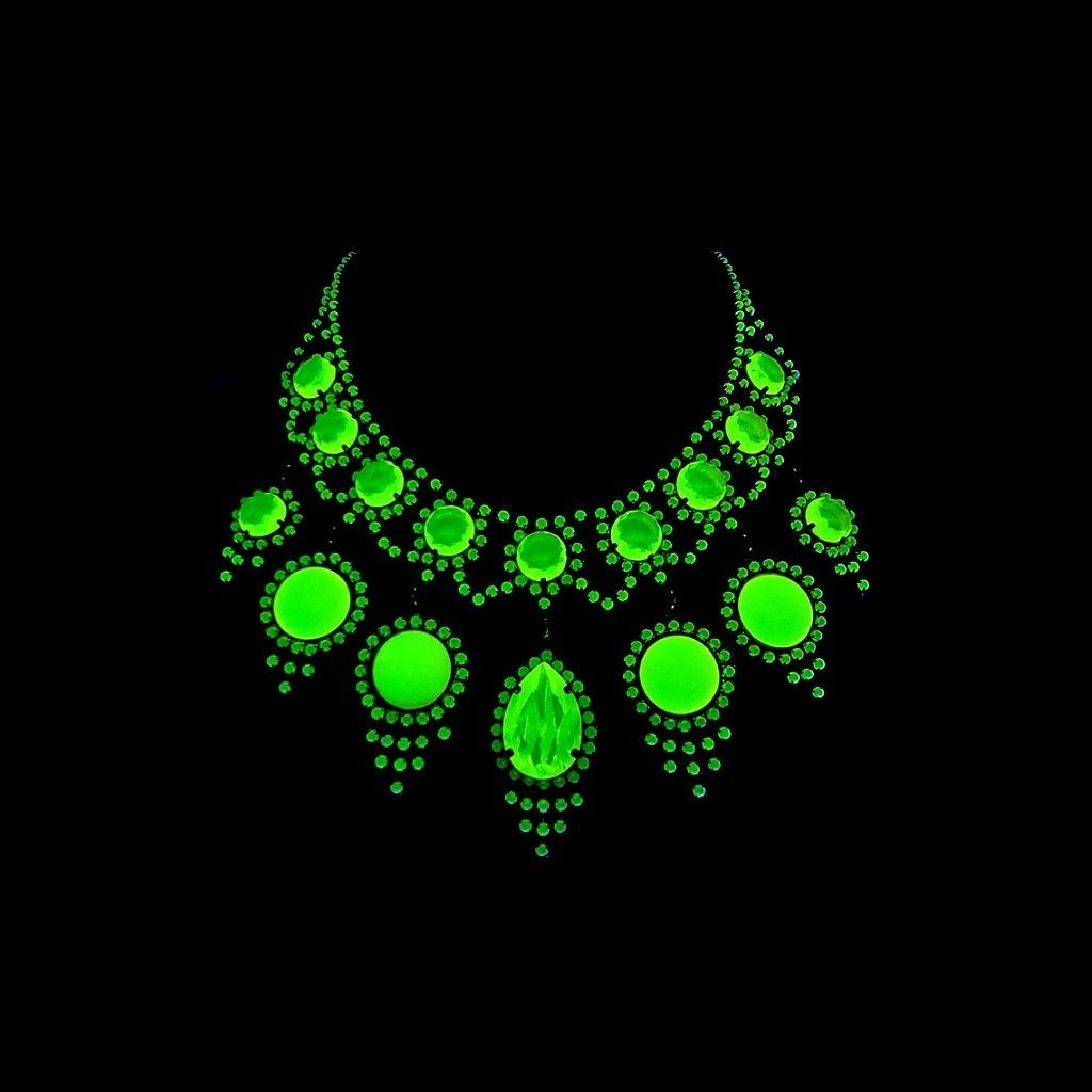 This piece is a highly collectible example of Czech uranium glass jewelry, valued for its craftsmanship, decorative presence, and UV reactivity. It is suitable for wear or as part of a vintage uranium glass jewelry collection.