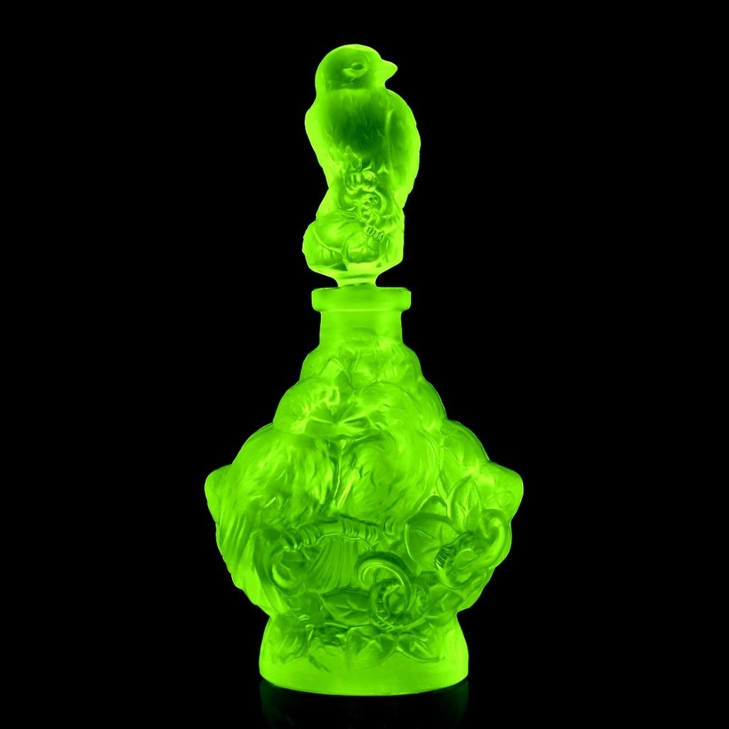 Made of uranium glass, commonly known as vaseline glass, the bottle exhibits vivid green fluorescence under UV light, confirming its uranium content. The crisp mold definition, figural bird stopper, and deeply sculpted relief make this piece highly desirable for collectors of H. Hoffmann perfume bottles and uranium glass.