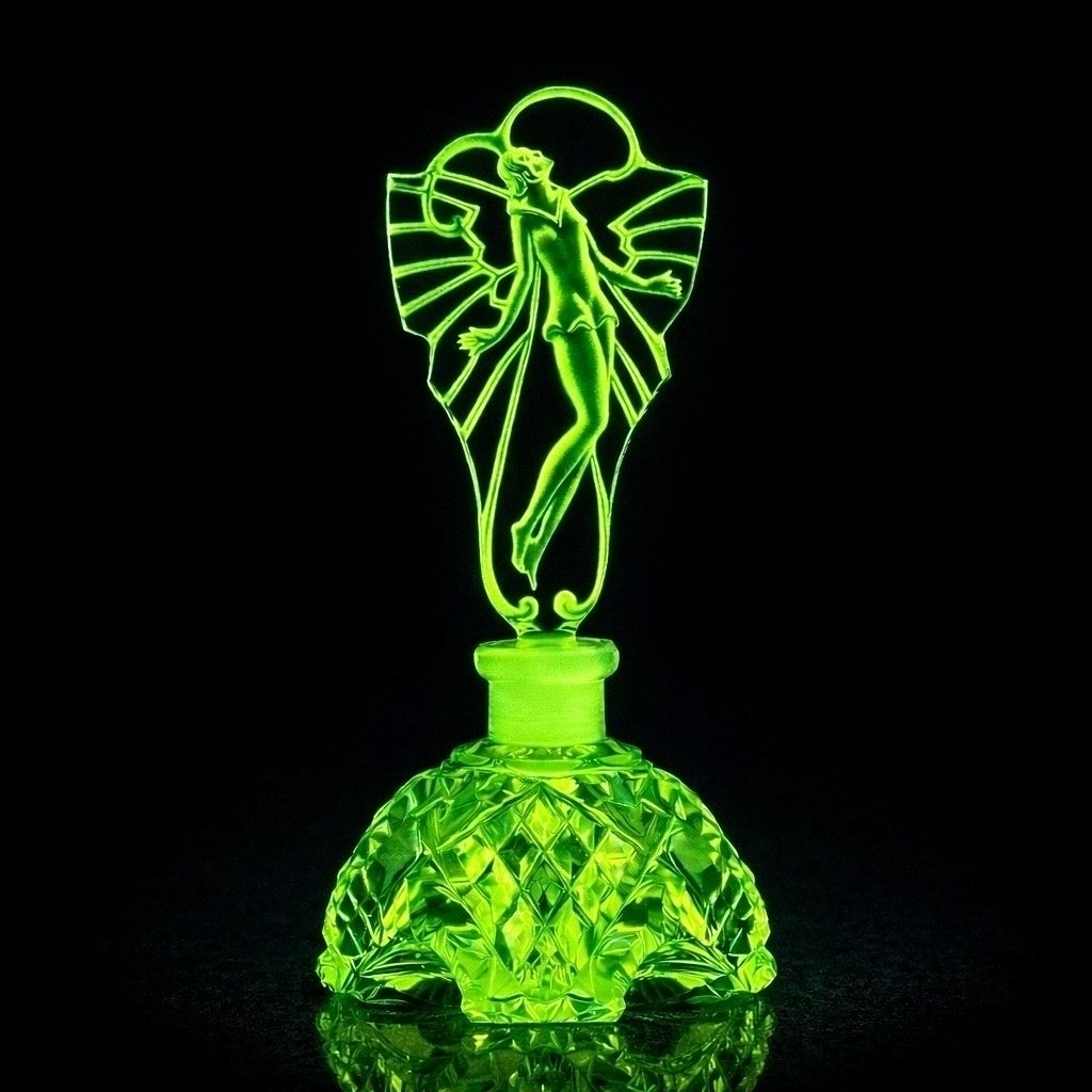 This yellow uranium glass perfume bottle was produced in Bohemia from an original mold designed around 1930, during the height of the Art Deco movement. The sculptural stopper features a graceful dancing lady framed by radiating Deco lines and a circular halo form, creating a dramatic vertical silhouette characteristic of Bohemian Art Deco design.