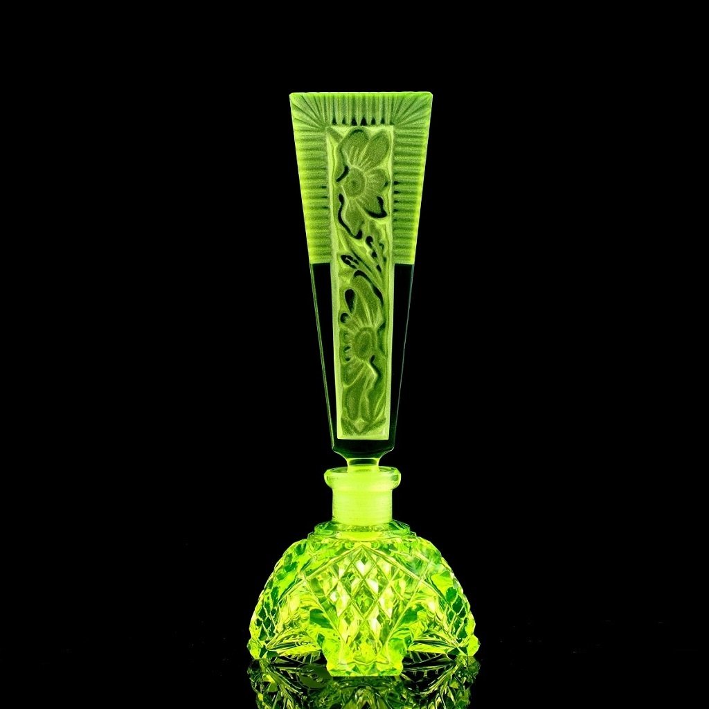 Made of uranium glass, commonly known as vaseline glass, the bottle exhibits vivid green fluorescence under UV light, confirming its uranium content. The architectural presence and balanced proportions make this piece especially desirable for collectors of Art Deco perfume bottles and uranium glass.