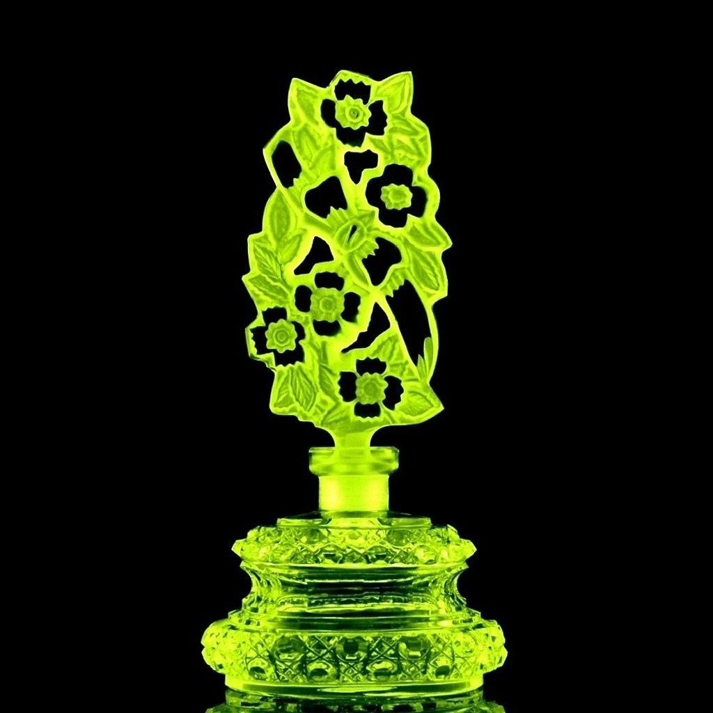 Made of uranium glass, commonly known as vaseline glass, the bottle exhibits vivid green fluorescence under UV light, confirming its uranium content. The refined sculptural form and balanced Deco proportions create strong display presence, making this piece highly desirable for collectors of Art Deco perfume bottles and uranium glass.
