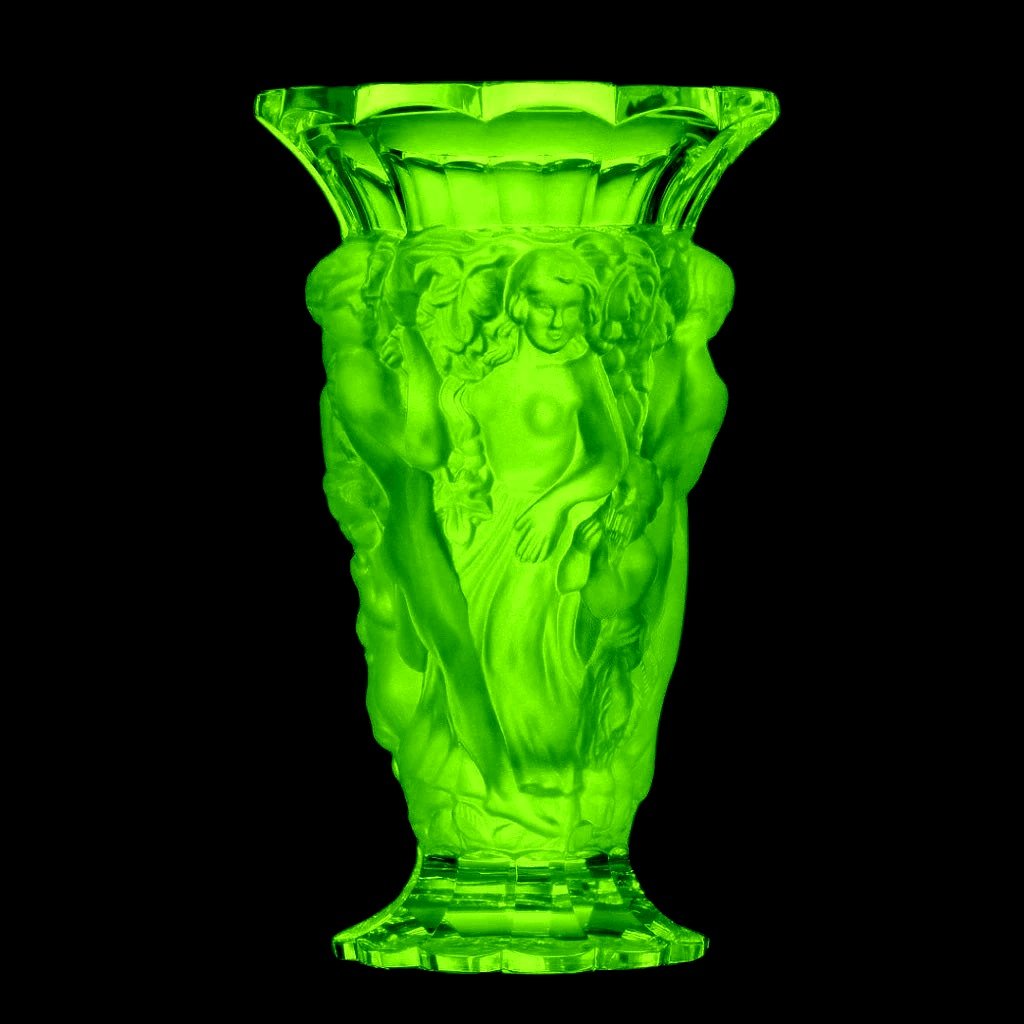 Made of yellow uranium glass, commonly referred to as vaseline glass, the vase exhibits vivid green fluorescence under UV light, clearly visible under blacklight and confirming its uranium glass composition. The raised pedestal amplifies the vertical rhythm of the design, giving the piece a refined and monumental character within an Art Deco collection.